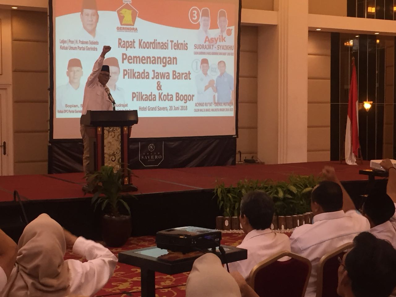 BOGOR DAILY – Pengurus Dewan Pimpinan Cabang (DPC) partai Gerakan Indonesia Raya atau Gerindra Kota Bogor, menggelar rapat koordinasi teknis (Rakornis) untuk pemenangan pemilihan gubernur (pilgub), yang mengusung pasangan Sudrajat dan Syaikhu, serta pemenangan pemilihan Wali Kota (pilwalkot), yang mengusung pasangan Ahmad Ru’yat dan Zainul Muttaqien. Rapat digelar di grand Savero, Jl. Pajajaran, Kota Bogor, Rabu, 20 Juni 2018.