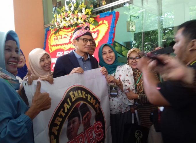 Bogor Daily – Dengan membawa spanduk bertuliskan ‘Pepes Emak-emak’, puluhan ibu-ibu berdiri di depan pintu keluar Mal Botani Square mencegat bakal calon wakil presiden Indonesia Sandiaga Uno, kemarin. Ternyata mereka relawan dari Partai Emak-emak pendukung Prabowo-Sandi. Selain menyapa dan memberi dukungan di pilpres 2019, emak-emak itu memanfaatkan momentum tersebut untuk foto bersama.