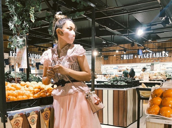 Meski bergaun, Hesty tetap memakai masker sesuai aturan. Ternyata, ada yang masih mengenalinya.