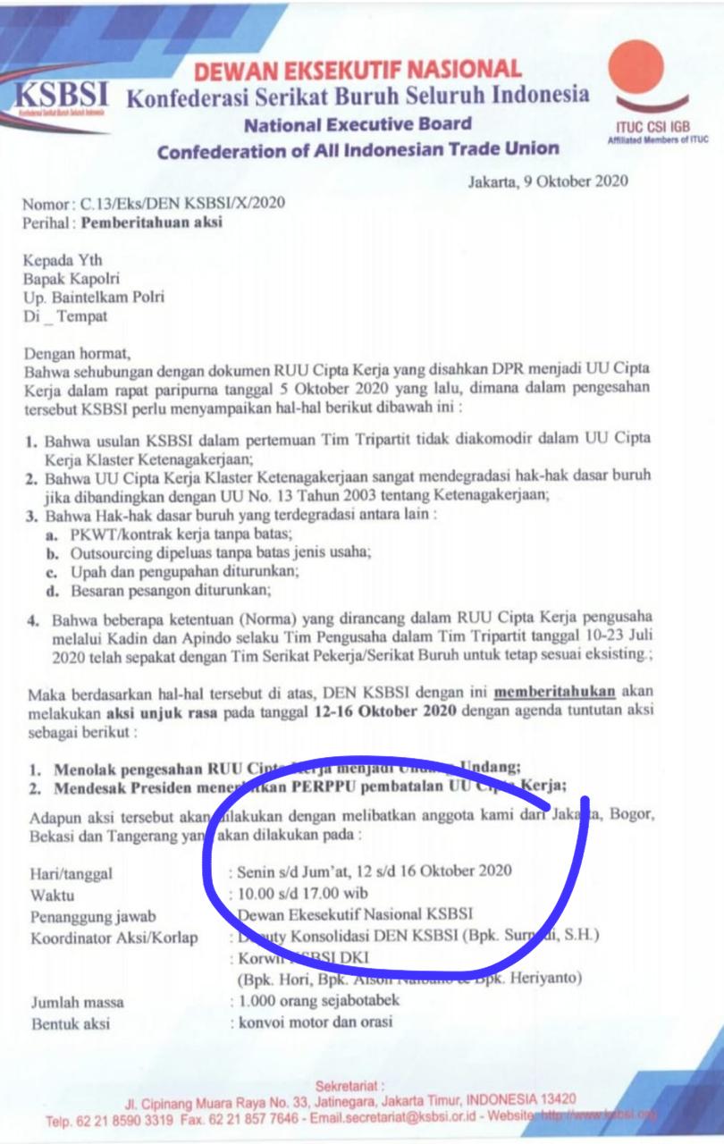 Rencana DEN KSBSI menggelar unjuk rasa tertuang dalam surat pemberitahuan aksi kepada kepolisian pada Jumat lalu (9/10). Surat pemberitahuan aksi ini diteken Deputi Presiden Bidang Konsolidasi DEN KSBI Surnadi. “Kami aksi Senin,” kata dia.