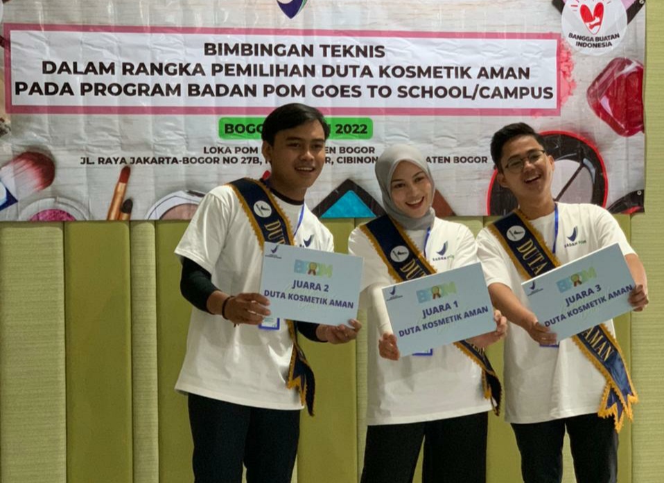 Ketiga orang Duta Kosmetik Aman Terbaik Loka POM Bogor Tahun 2022 tersebut, yaitu terbaik pertama, Aliyah Balfas dari IPb University, terbaik kedua Muhammad Fajar dari Universitas Pakuan serta terbaik Muhammad Gunawan Syahputra.