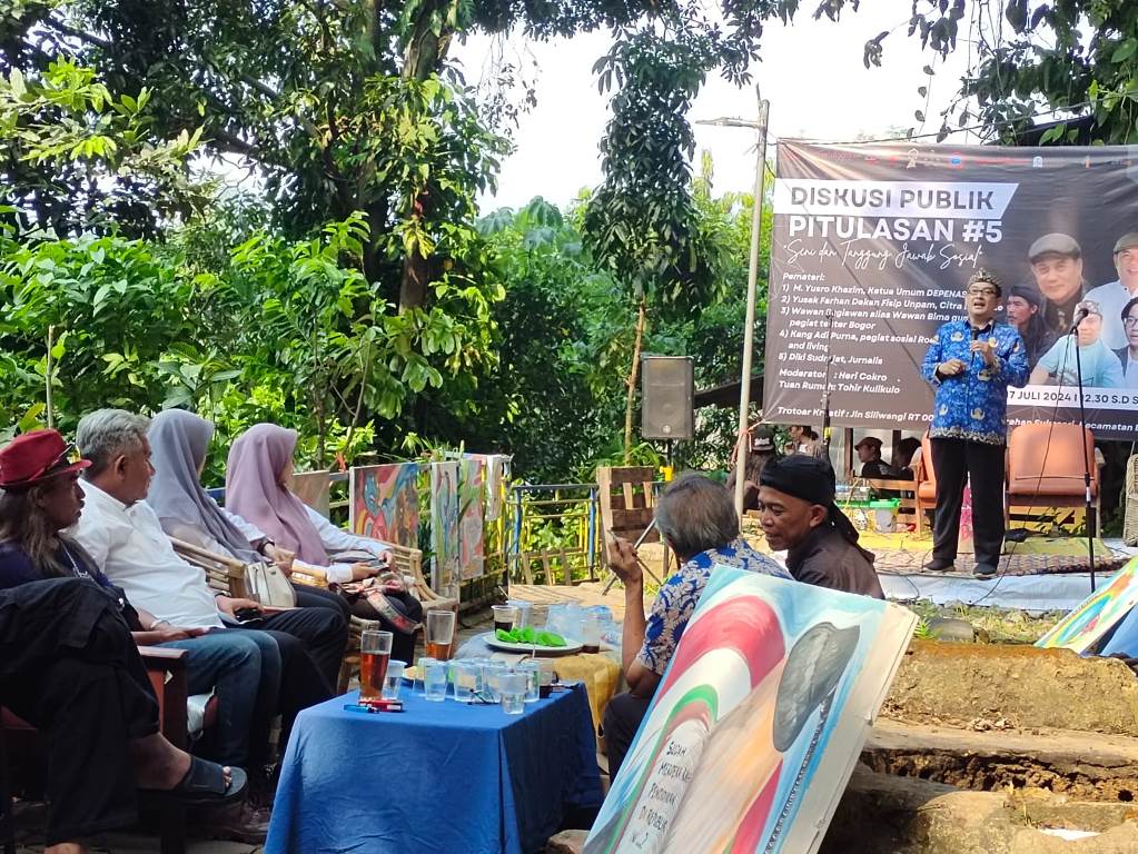Diskusi publik dilaksanakan rutin setiap tangga 17 setiap bulan, kali ini diskusi Pitulasan memasuk episode yang ke lima dengan tema Seni dan Tanggung Jawab Sosial. Pada kesempatan itu menghadirkan pembicara M.Yusro Khazim Ketua Umum Dewan Pengurus Nasional (Depenas) Serikat Buruh Nasional Indonesia (SBNI), Diki Sudrajat Jurnalis, Rachmat Iskandar (Sejarawan) dan Ki Agus Prana (Budayawan).