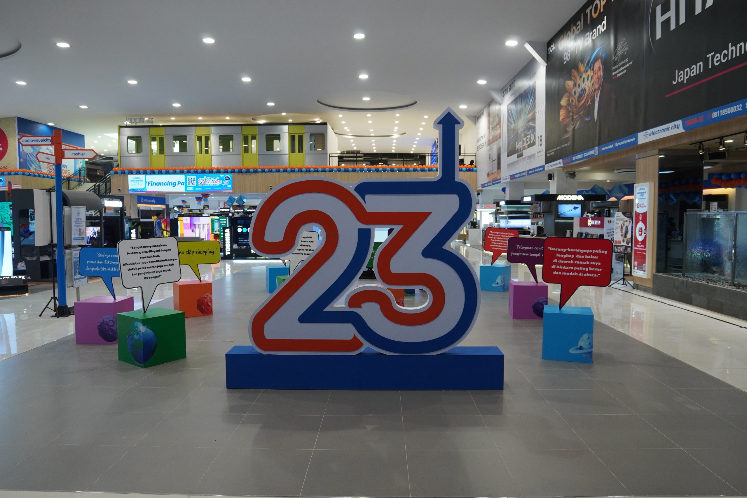 Dalam grand re-opening yang kali ini bertepatan dengan tema ulang tahun Journey 23xplore, Electronic City menghadirkan berbagai promo khusus berupa voucher hingga 23 juta, diskon promo banking hingga 2,3 juta, road show pameran elektronik di 5 titik mall terkemuka, serta berbagai hadiah langsung yang dapat diberikan kepada pelanggan setia kami.