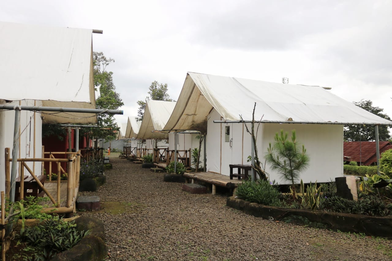 Bagi Anda yang ingin merasakan sensasi glamping, Grand Royale Tapos menyediakan tenda sarnaville dengan fasilitas kamar mandi di dalam lengkap dengan water heater.