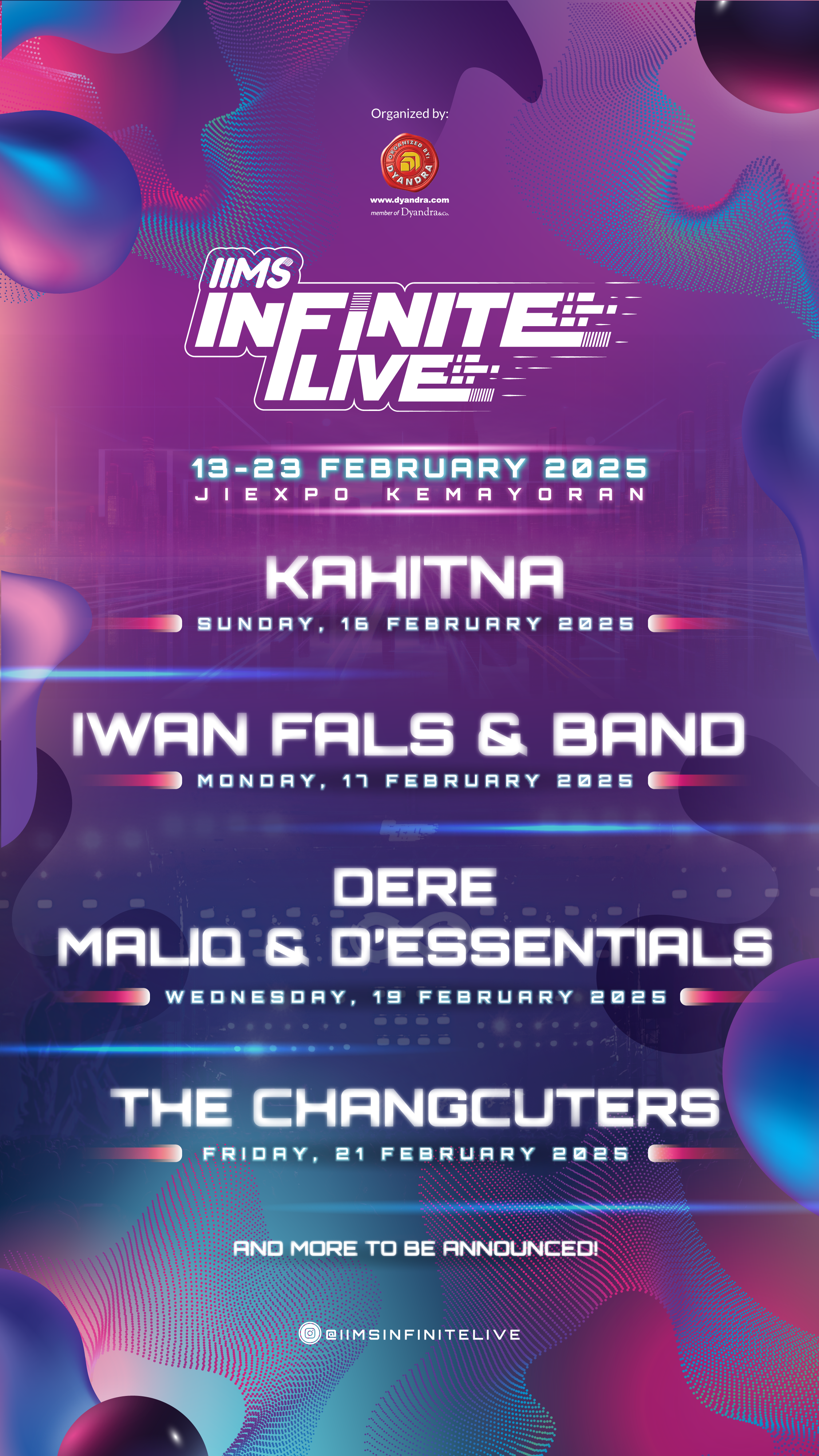 Lineup fase pertama IIMS Infinite Live 2025 dimeriahkan oleh musisi-musisi besar lintas masa dan genre, seperti Iwan Fals, The Changcuters, Maliq & D’Essentials, Kahitna, hingga Dere. Sebagai bagian dari pameran otomotif terkemuka yang konsisten digelar setiap tahun, IIMS Infinite Live dan IIMS Infinite Show menghadirkan perpaduan unik antara penampilan musisi ternama, pertunjukan otomotif spektakuler, atraksi memukau, dan karya seni inspiratif, menjadikan IIMS 2025 sebuah acara yang tak hanya edukatif, tetapi juga menghibur bagi semua kalangan.