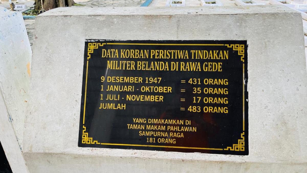 Di Taman Makam Pahlawan Sampurna Raga Desa Balongsari Kec Rawamerta Kab Karawang, dimakamkan 181 dari 431 orang korban pembantaian Belanda.