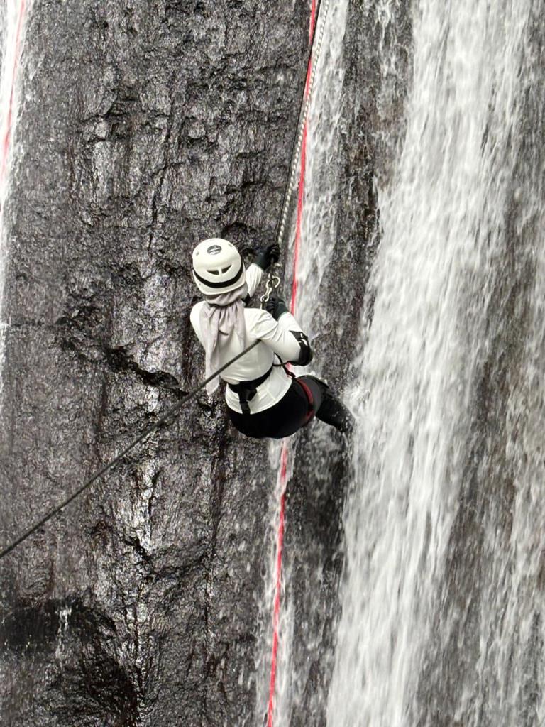 Satu per satu peserta mulai turun menaklukkan air terjun setinggi belasan meter. Ekspresi yang terlihat beragam ada yang menjerit karena terkejut, ada yang tertawa, bahkan ada yang tenang menikmati setiap detik turunnya.
