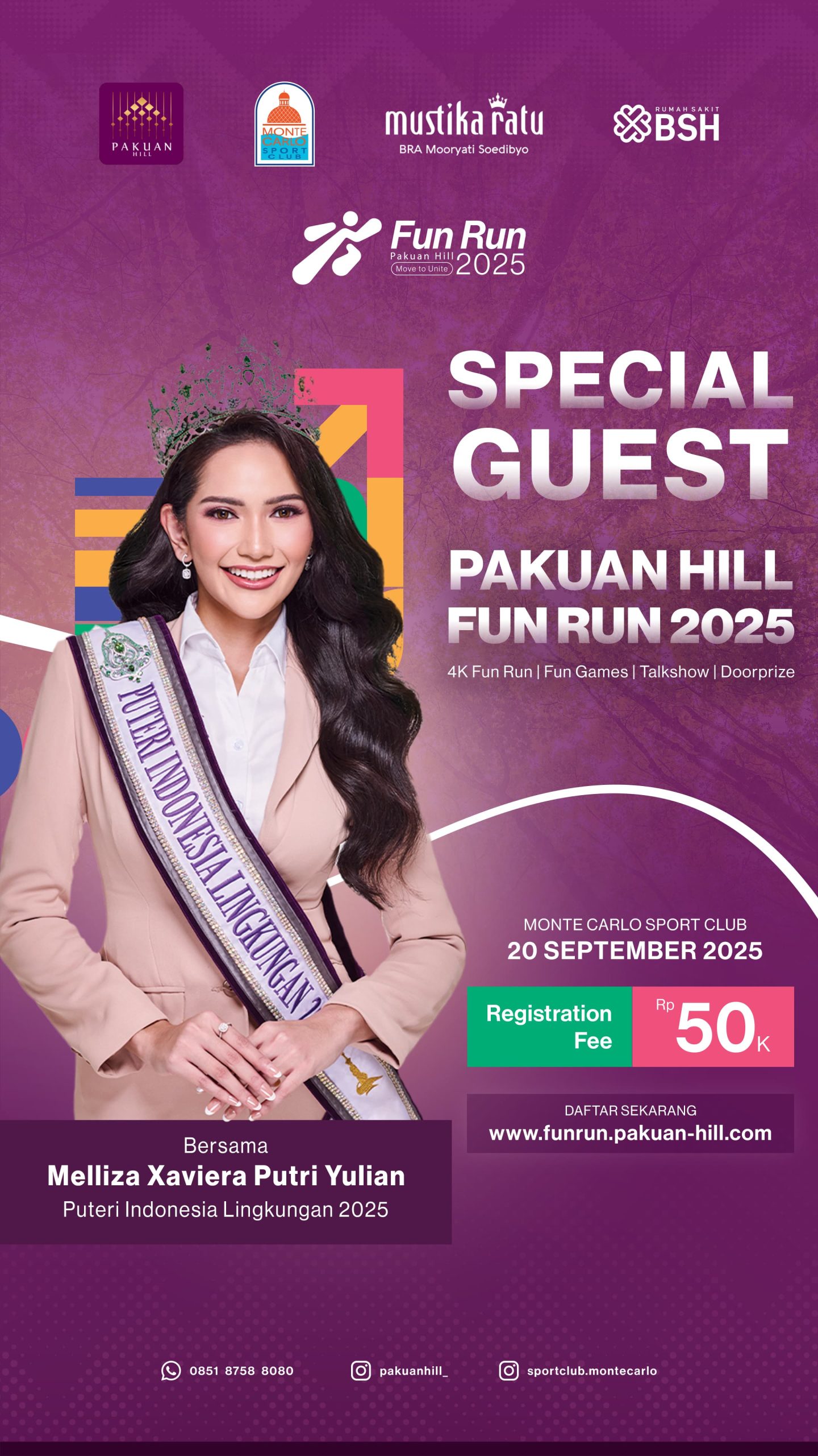 Acara ini juga akan dimeriahkan oleh Spesial Guest: Puteri Indonesia Lingkungan 2025, Melliza Xaviera Putri Yulian, yang akan hadir memberi semangat bagi para pelari.