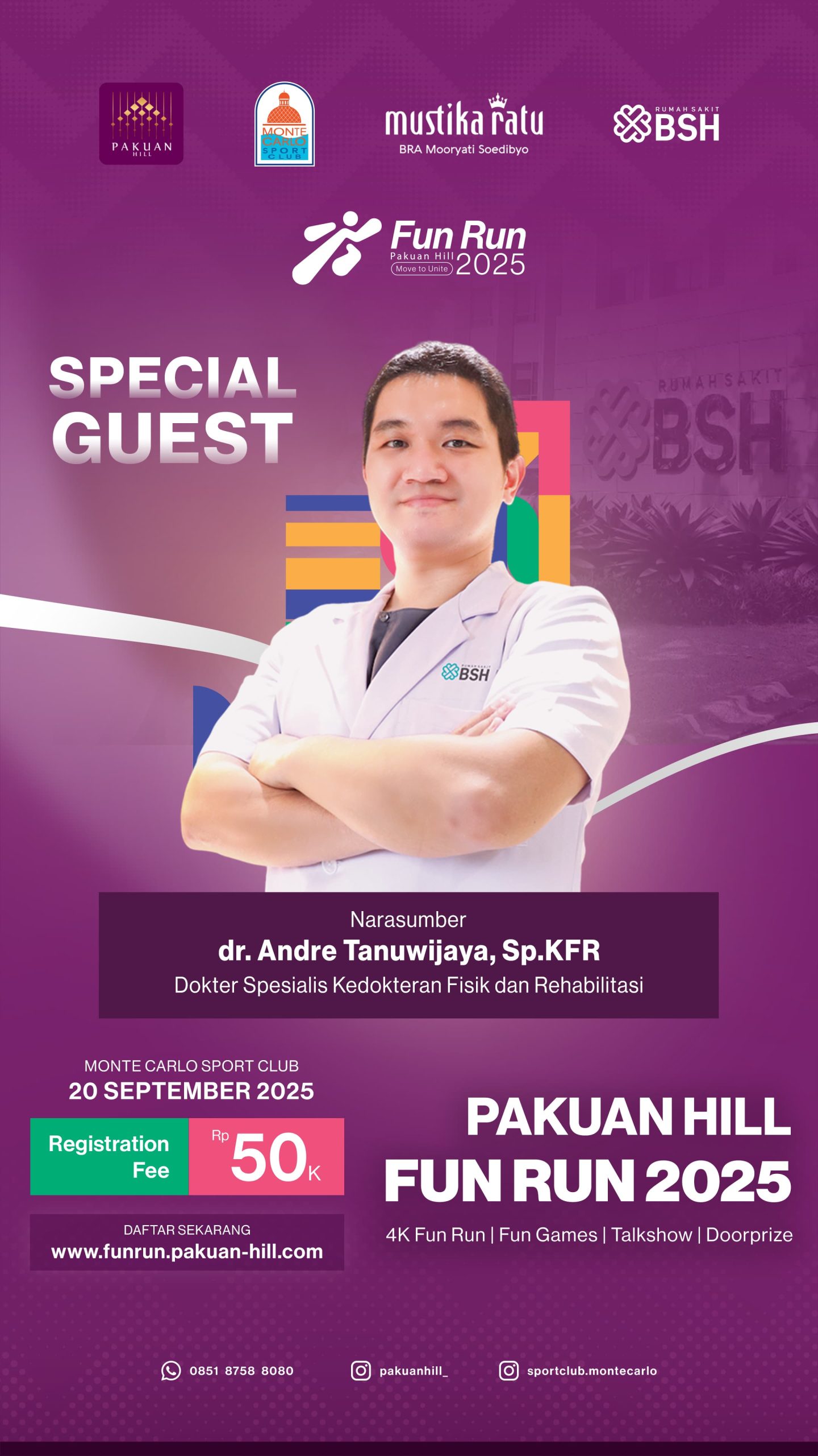 Tidak hanya itu, talk show akan menghadirkan narasumber ahli, dr. Andre Tanuwijaya, Sp.KFR Dokter Spesialis Kedokteran Fisik dan Rehabilitasi dari Rumah Sakit BSH yang akan membagikan tips menjaga kebugaran, mencegah cedera, dan memaksimalkan performa olahraga.