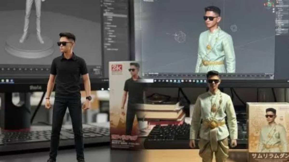 “Gambar ultra-realistis seorang pemuda yang duduk di meja komputer. Ia tersenyum sambil memegang patung koleksi dirinya dengan detail skala 1/7. Di sampingnya terdapat kotak mainan bermerek dengan desain yang sama. Monitor di belakang menampilkan model 3D dalam software pemahat digital. Komposisi sinematik dengan pencahayaan lembut.”