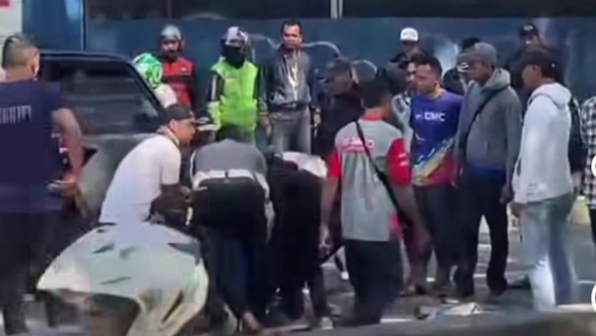 Terlihat tubuh korban tergeletak, dengan warga dan pengendara lain berhenti, sebagian mencoba menolong, sebagian lagi hanya terpaku menyaksikan.