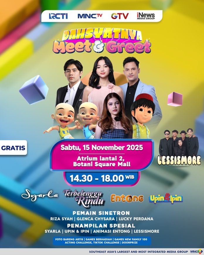 Ikuti keseruan serta kemeriahan Dahsyatnya Meet & Greet Terbelenggu Rindu, hari Sabtu, 15 November 2025 mulai pukul 14.30 WIB secara langsung di Atrium Lantai 2 Botani Square Mall. Untuk warga Bogor dan sekitarnya, jangan sampai ketinggalan ya! Acara ini gratis tanpa biaya apapun!