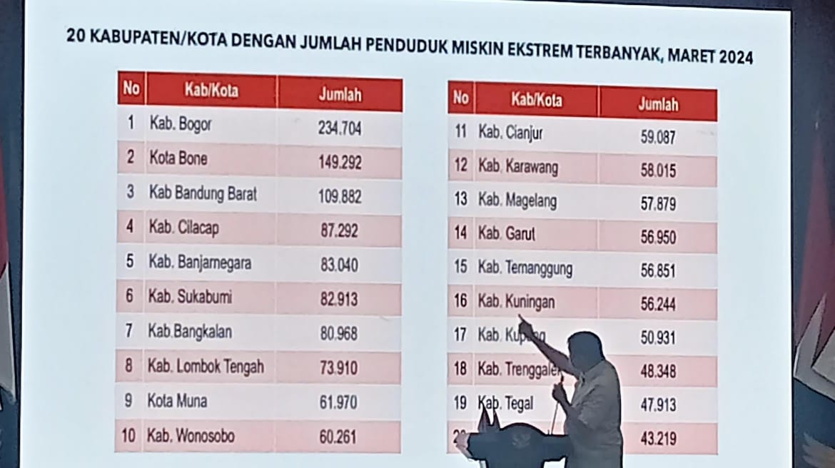 Berdasarkan data Badan Pusat Statistik (BPS) yang dipaparkan Kementerian PKP, Kabupaten Bogor menempati posisi pertama dengan jumlah penduduk miskin mencapai 401,86 ribu jiwa.