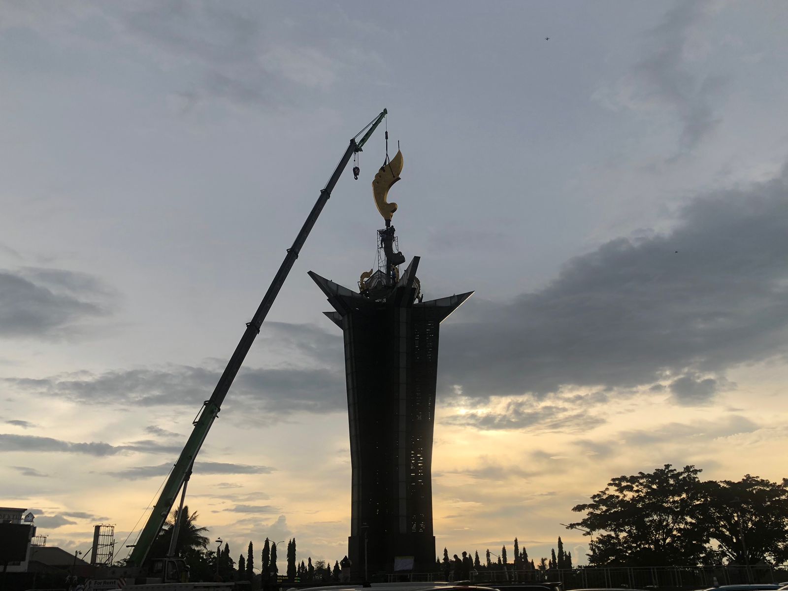Berdasarkan pantauan di lokasi terlihat, sejumlah petugas tengah melakukan pemasangan ornamen kujang sepanjang 14 meter itu menggunakan alat crane.
