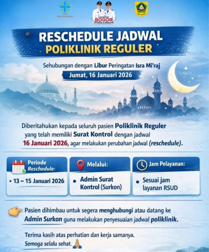 Bogordaily.net – Rumah Sakit Umum Daerah (RSUD) Bakti Pajajaran Cibinong menginformasikan reschedule jadwal pelayanan Poliklinik Reguler sehubungan dengan libur Isra Miraj Jum’at 16 Januari 2026.