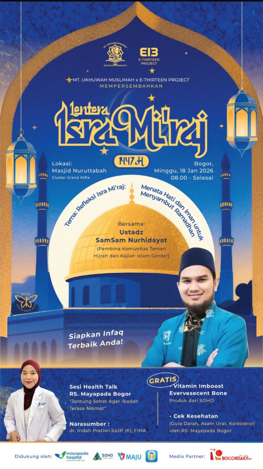Bogordaily.net – Dalam rangka memperingati Isra Mi’raj Nabi Muhammad SAW 1447 Hijriah, pengurus Masjid Nuruttaubah Cluster Grand Alifa, Bogor, akan menggelar kegiatan keagamaan bertajuk Lentera Isra Mi’raj 1447 H pada Minggu, 18 Januari 2026.
