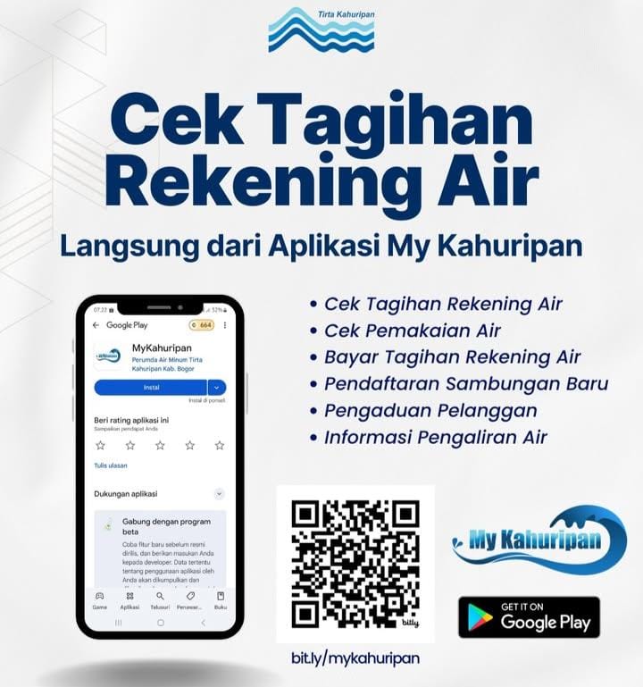 Bogordaily.net – Perumda Air Minum Tirta Kahuripan Kabupaten Bogor memberikan kemudahan untuk cek tagihan air melalui aplikasi “My Kahuripan”.
