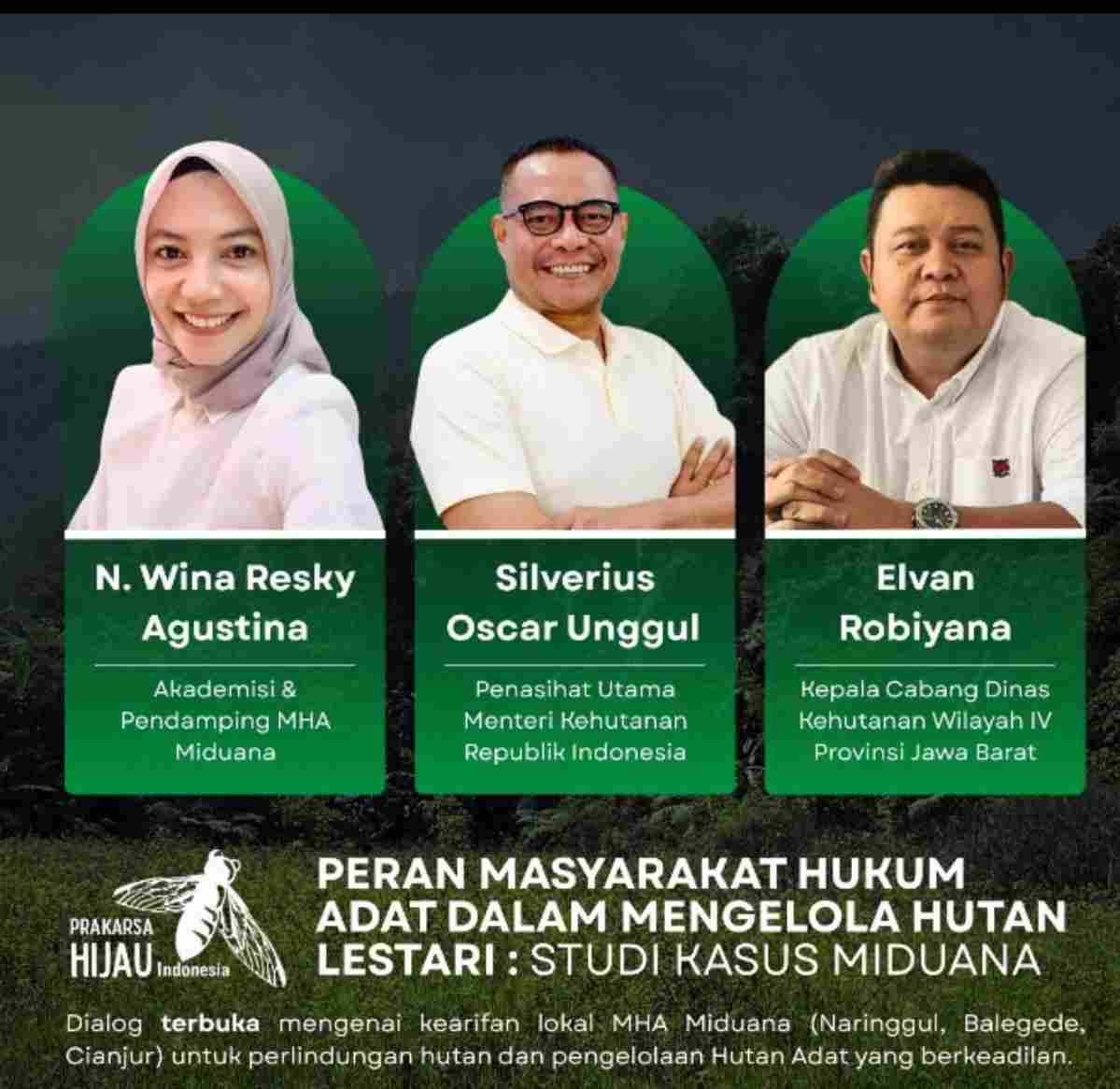 Sejumlah narasumber hadir dalam dialog tersebut, di antaranya Akademisi sekaligus Pendamping MHA Miduana N. Wina Resky Agustina, Penasihat Utama Menteri Kehutanan RI Silverius Oscar Unggul, serta Kepala CDK Wilayah IV Provinsi Jawa Barat Elvan Robiyana.