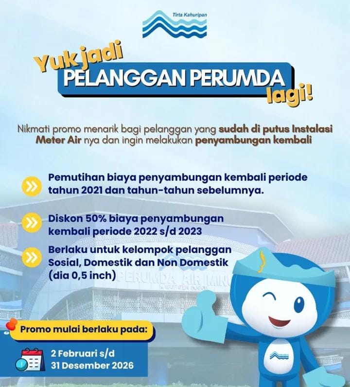 Promo ini tentu menjadi kabar baik bagi masyarakat yang ingin mulai berlangganan layanan air bersih dari Tirta Kahuripan, terutama bagi pelaku usaha kecil atau keluarga baru yang sedang membangun rumah.