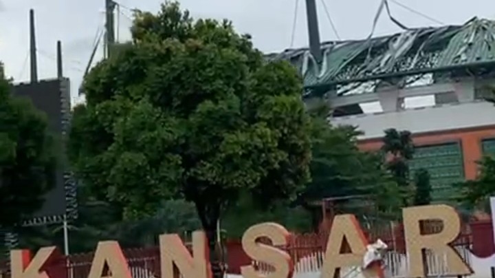 Kondisi terkini atap Stadion Pakansari ikut rusak setelah diterjang badai dahsyat itu.