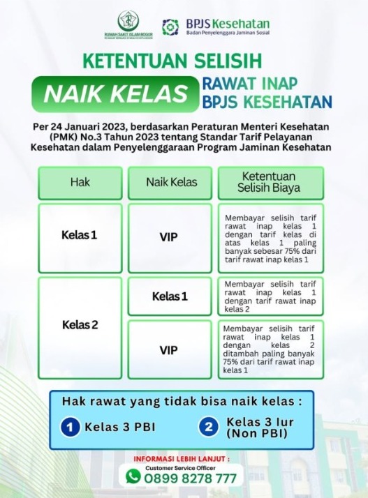 Pihak RS Islam Bogor mengimbau masyarakat untuk memahami aturan ini sebelum mengajukan kenaikan kelas, agar proses pelayanan dapat berjalan dengan lancar dan transparan.