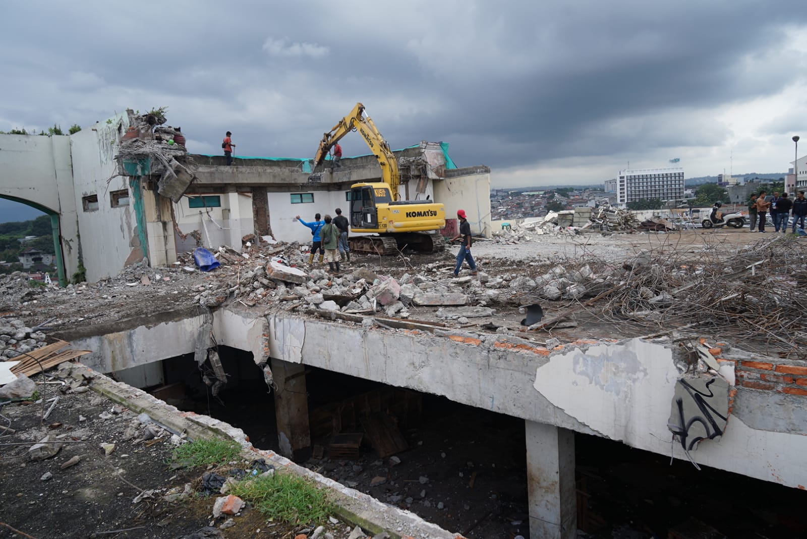 Deru mesin alat berat semakin kencang terdengar. Seolah tak mau berhenti merobohkan bangunan pasar berlantai lima.