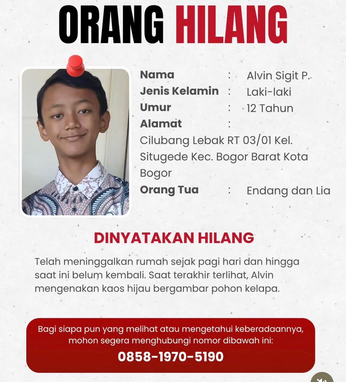 Menurut keterangan keluarga, Alvin meninggalkan rumah sejak pagi hari pada 25 April 2026 dan hingga kini belum kembali.